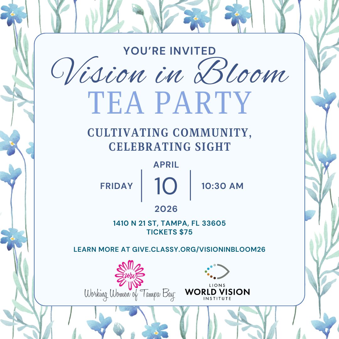 Step into an enchanting tea party fundraiser, “Vision in Bloom,” hosted by Lions World Vision Institute and Working Women of Tampa Bay at LWVI’s historic cigar factory headquarters. Experience the fusion of elegance and purpose while supporting vision as a basic human right. Indulge in tea and treats amidst camaraderie, as every cup poured and conversation shared promises to blossom into a brighter tomorrow of unity and compassion. Purchase your tickets now for a day of grace and philanthropy.