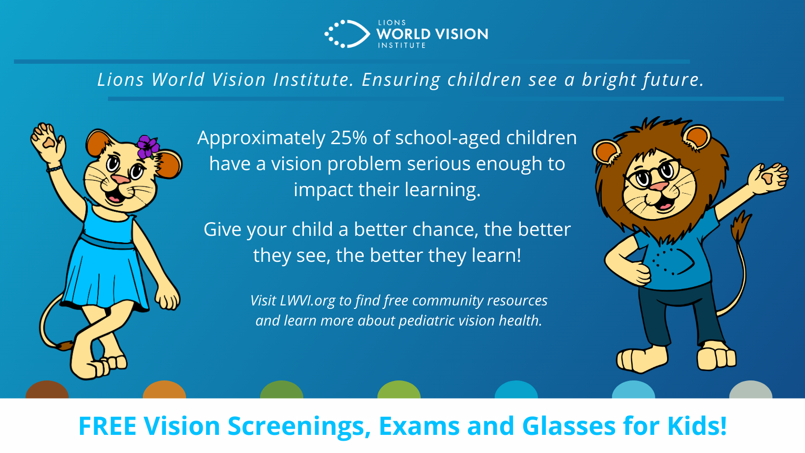 Vision is a strong predictor of academic performance in children. Yet, 1 in 4 children have an undiagnosed vision problem. Vision disorders in children affect cognitive, social, and physical development; future health; and well-being. An eye health problem can be the reason a child does not perform well at school. Conditions such as amblyopia (lazy eye) or strabismus (crossed eye) can go undetected and, if not addressed by the time a child is eight years old when eyesight is fully developed, can lead to lifelong problems and result in an irreversible loss of sight. The Lions World Vision Institute is dedicated to the ocular health of our nation’s children and has launched three vision health programs: